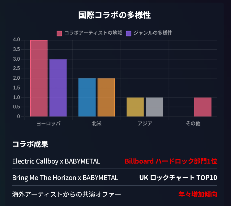 これは、BABYMETALの音楽性が、海外の音楽ファンに、より受け入れられているためと考えられます。