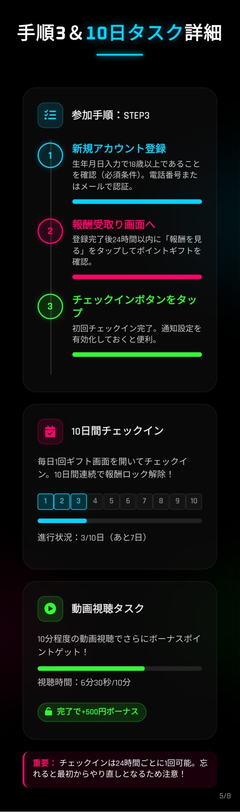 特に、10日間連続でチェックインするタスクが重要であり、この部分をしっかりと押さえておくことが成功のカギです。